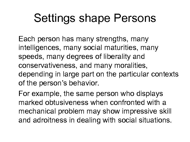 Settings shape Persons Each person has many strengths, many intelligences, many social maturities, many speeds, many degrees of liberality and conservativeness, and many moralities, depending in large part on the particular contexts of the person’s behavior. For example, the same person who displays marked obtusiveness when confronted with a mechanical problem may show impressive skill and adroitness in dealing with social situations.