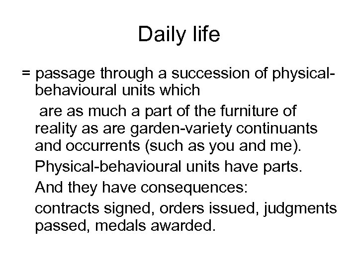 Daily life = passage through a succession of physicalbehavioural units which are as much a part of the furniture of reality as are garden-variety continuants and occurrents (such as you and me). Physical-behavioural units have parts. And they have consequences: contracts signed, orders issued, judgments passed, medals awarded.