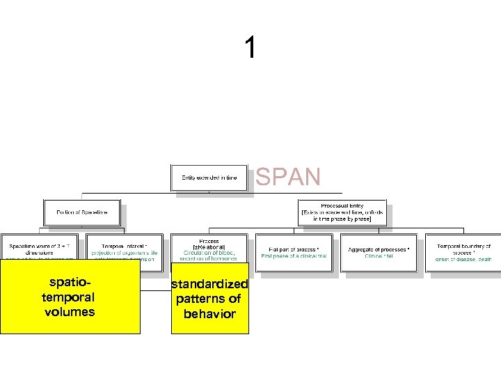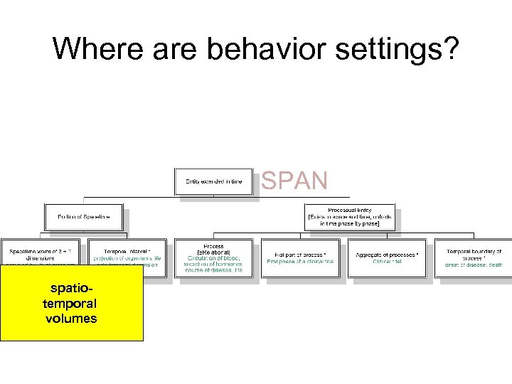 Where are Niches? Concrete Entity in Space and Time] [Exists Entity in 4 -D Ontology [Perdure. Unfold in Time] Entity in 3 -D Ontology [Endure. No Temporal Parts] Spatial Region of Dimension 0, 1, 2, 3 Independent Entity Dependent Entity Processual Entity Spatio-Temporal Region Dim = T, T+0, T+1, T+2, T+3 Substance [maximally connected causal unity] Process [Has Unity] Clinical trial; exercise of role Aggregate of Substances * (includes masses of stuff? liquids? ) Aggregate of Processes* Role, Function, Power Have realizations (called: Processes) Fiat Part of Substance * Nose, Ear, Mountain Fiat Part of Process* Quasi-Role/Function/Power The Functions of the President Boundary of Substance * Fiat or Bona Fide or Mixed Instantaneous Temporal Boundary of Process (= Ingarden’s 'Event’)* Quasi-Substance Church, College, Corporation Quasi-Process John’s Youth. John’s Life Quality (Your Redness, My Tallness) [Form Quality Regions/Scales] Quasi-Quality Prices, Values, Obligations