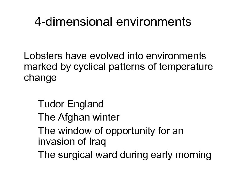 4 -dimensional environments Lobsters have evolved into environments marked by cyclical patterns of temperature change Tudor England The Afghan winter The window of opportunity for an invasion of Iraq The surgical ward during early morning