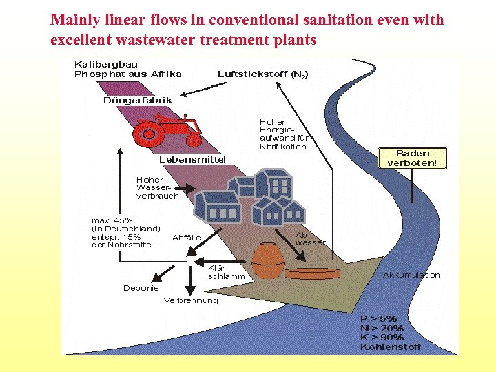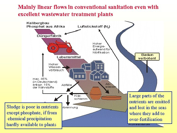 Mainly linear flows in conventional sanitation even with excellent wastewater treatment plants Sludge is poor in nutrients except phosphate, if from chemical precipitation hardly available to plants Large parts of the nutrients are emitted and lost in the seas where they add to over-fertilisation