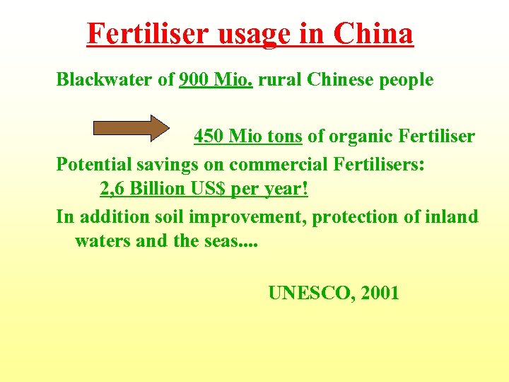 Fertiliser usage in China Blackwater of 900 Mio. rural Chinese people 450 Mio tons of organic Fertiliser Potential savings on commercial Fertilisers: 2, 6 Billion US$ per year! In addition soil improvement, protection of inland waters and the seas. . UNESCO, 2001