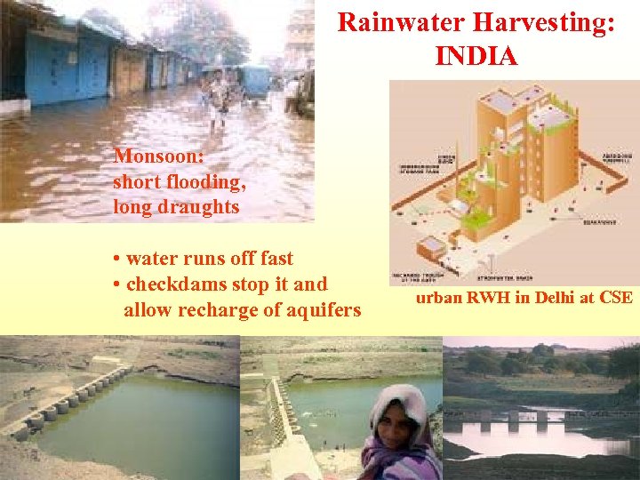 Rainwater Harvesting: INDIA Monsoon: short flooding, long draughts • water runs off fast • checkdams stop it and allow recharge of aquifers urban RWH in Delhi at CSE