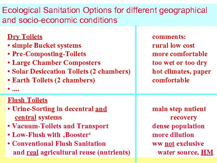 Ecological Sanitation Options for different geographical and socio-economic conditions Dry Toilets • simple Bucket systems • Pre-Composting-Toilets • Large Chamber Composters • Solar Desiccation Toilets (2 chambers) • Earth Toilets (2 chambers) • . . Flush Toilets • Urine-Sorting in decentral and central systems • Vacuum-Toilets and Transport • Low-Flush with ‚Booster‘ • Conventional Flush Sanitation and real agricultural reuse (nutrients) comments: rural low cost more comfortable too wet or too dry hot climates, paper comfortable main step nutient recovery dense population more dilution ww not exclusive water source, HM