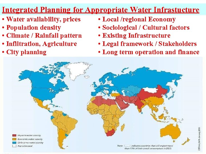 Integrated Planning for Appropriate Water Infrastucture • Water availability, prices • Population density • Climate / Rainfall pattern • Infiltration, Agriculture • City planning • Local /regional Economy • Sociological / Cultural factors • Existing Infrastructure • Legal framework / Stakeholders • Long term operation and finance