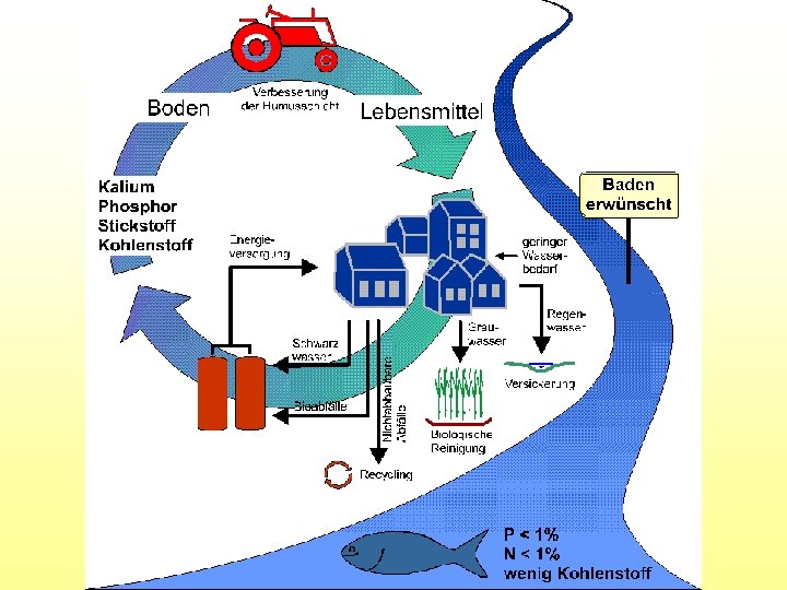 Volume l/(P*year) Greywater 25. 000 -100. 000 Yearly Loads kg/(P*year) Flushwater can be saved 6. 000 - 25. 000 Urine ~ 500 Feaces ~ 50 (option: add biowaste) N ~ 4 -5 ~3 % ~ 87 % ~ 10 % P ~ 0, 75 ~ 10 % ~50 % ~ 40 % K ~ 1, 8 ~ 34 % ~ 54 % ~ 12 % ~ 41 % ~ 12 % ~ 47 % COD ~ 30 Treatment Biogas-Plant Composting Reuse / Water Cycle S, Ca, Mg and trace elements Fertiliser Soil-Conditioner Geigy, Wiss. Tabellen, Basel 1981, Vol. 1, LARSEN and GUJER 1996, FITSCHEN and HAHN 1998