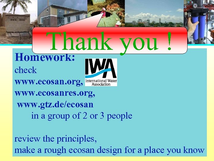 Thank you ! Goals of this class achieved? Homework: check there is a sanition crisis • see if www. ecosan. org, oriented saniation from • learn solutions of reuse examples www. ecosanres. org, • understand principles of ‘Ecological Sanitation’ www. gtz. de/ecosan • see the strength and limitations of decentral in water technologies 3 people a group of 2 or • get ideas for creative solutions adapted to the situation review the principles, make a rough ecosan design for a place you know