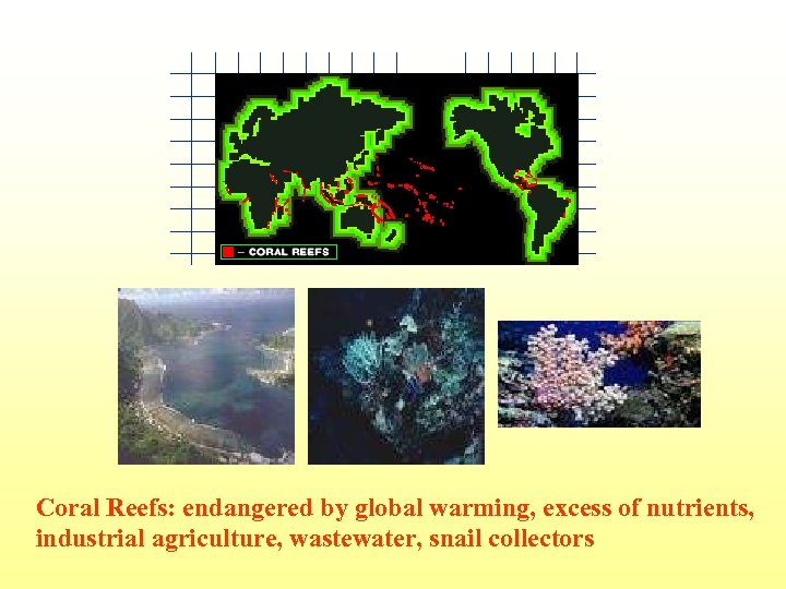 Coral Reefs: endangered by global warming, excess of nutrients, industrial agriculture, wastewater, snail collectors