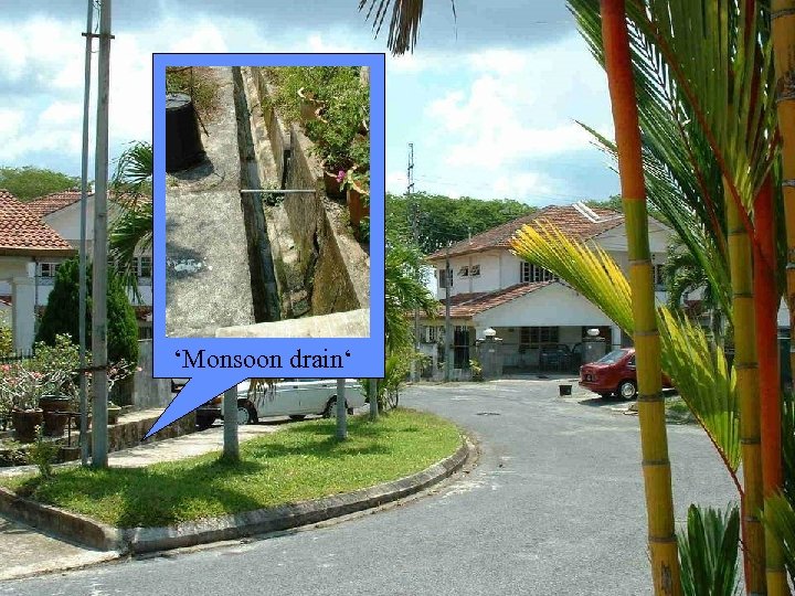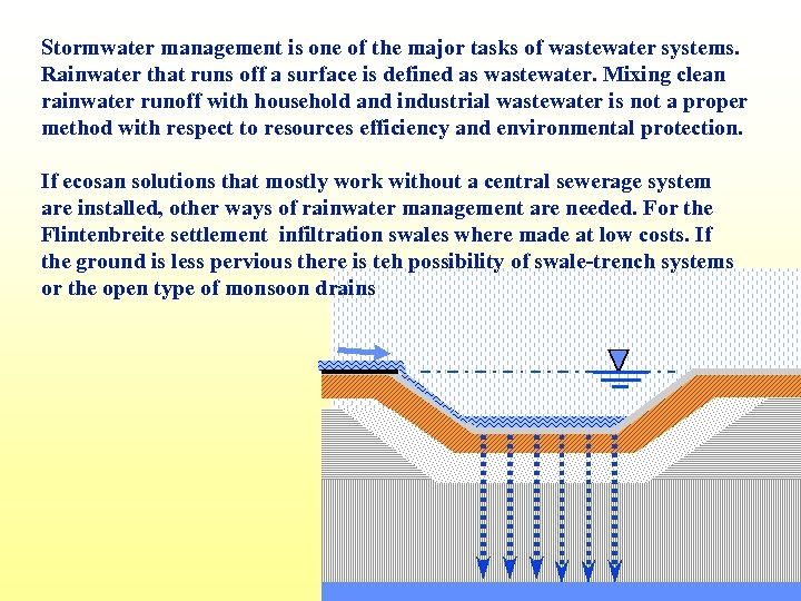Stormwater management is one of the major tasks of wastewater systems. Rainwater that runs off a surface is defined as wastewater. Mixing clean rainwater runoff with household and industrial wastewater is not a proper method with respect to resources efficiency and environmental protection. If ecosan solutions that mostly work without a central sewerage system are installed, other ways of rainwater management are needed. For the Flintenbreite settlement infiltration swales where made at low costs. If the ground is less pervious there is teh possibility of swale-trench systems or the open type of monsoon drains