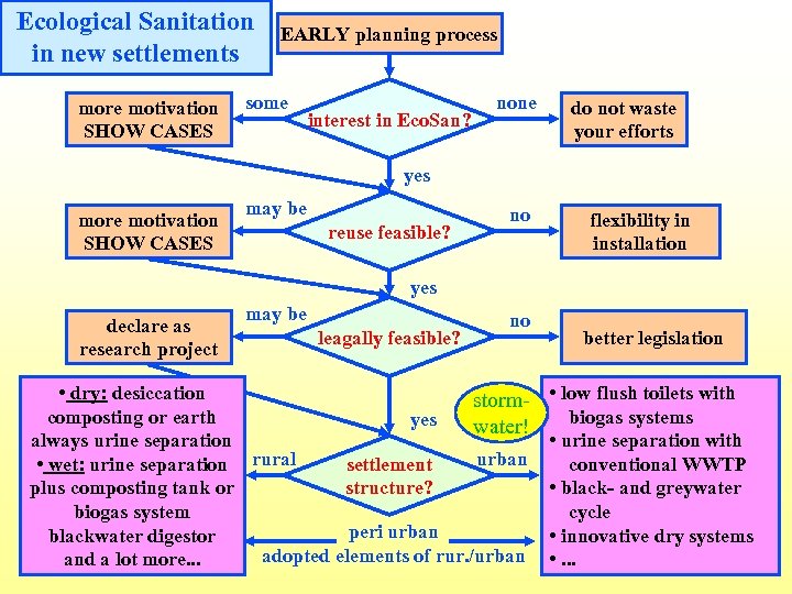 Ecological Sanitation in new settlements more motivation SHOW CASES EARLY planning process some interest in Eco. San? none do not waste your efforts yes more motivation SHOW CASES may be reuse feasible? no flexibility in installation yes declare as research project may be leagally feasible? no • dry: desiccation stormcomposting or earth yes water! always urine separation urban • wet: urine separation rural settlement plus composting tank or structure? biogas system peri urban blackwater digestor adopted elements of rur. /urban and a lot more. . . better legislation • low flush toilets with biogas systems • urine separation with conventional WWTP • black- and greywater cycle • innovative dry systems • . . .