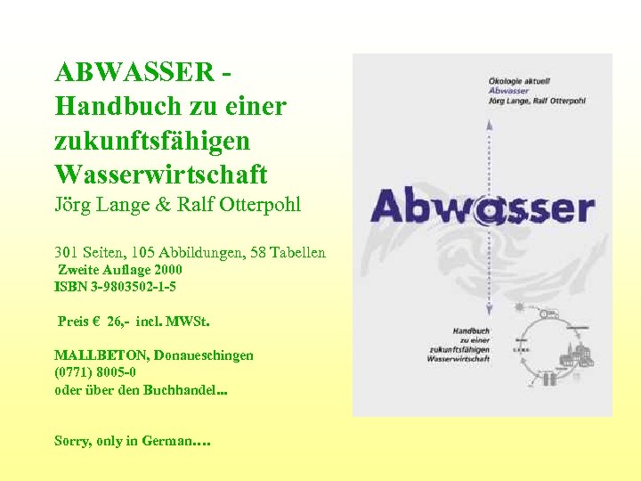 ABWASSER Handbuch zu einer zukunftsfähigen Wasserwirtschaft Jörg Lange & Ralf Otterpohl 301 Seiten, 105 Abbildungen, 58 Tabellen Zweite Auflage 2000 ISBN 3 -9803502 -1 -5 Preis € 26, - incl. MWSt. MALLBETON, Donaueschingen (0771) 8005 -0 oder über den Buchhandel. . . Sorry, only in German….