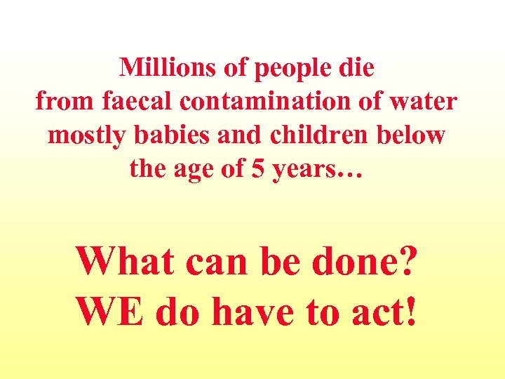 Millions of people die from faecal contamination of water mostly babies and children below the age of 5 years… What can be done? WE do have to act!