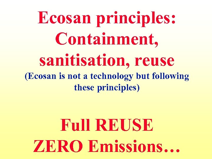Ecosan principles: Containment, sanitisation, reuse (Ecosan is not a technology but following these principles) Full REUSE ZERO Emissions…