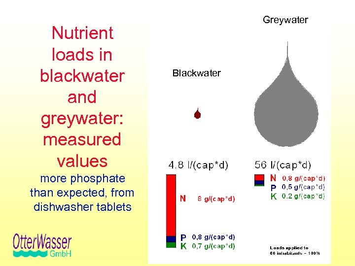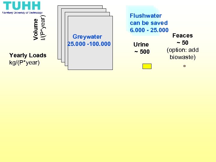 Volume l/(P*year) Yearly Loads kg/(P*year) Greywater 25. 000 -100. 000 Flushwater can be saved 6. 000 - 25. 000 Urine ~ 500 Feaces ~ 50 (option: add biowaste)