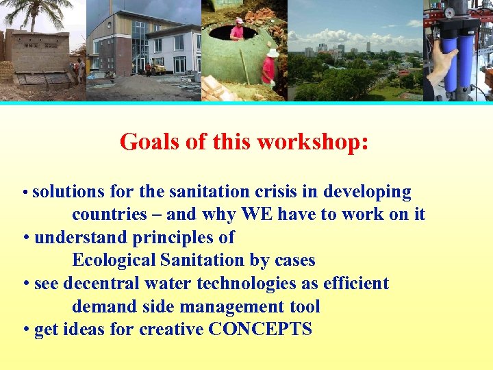 Goals of this workshop: • solutions for the sanitation crisis in developing countries – and why WE have to work on it • understand principles of Ecological Sanitation by cases • see decentral water technologies as efficient demand side management tool • get ideas for creative CONCEPTS