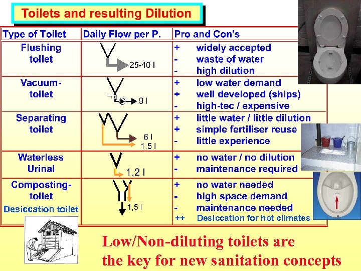 Desiccation toilet ++ Desiccation for hot climates Low/Non-diluting toilets are the key for new sanitation concepts