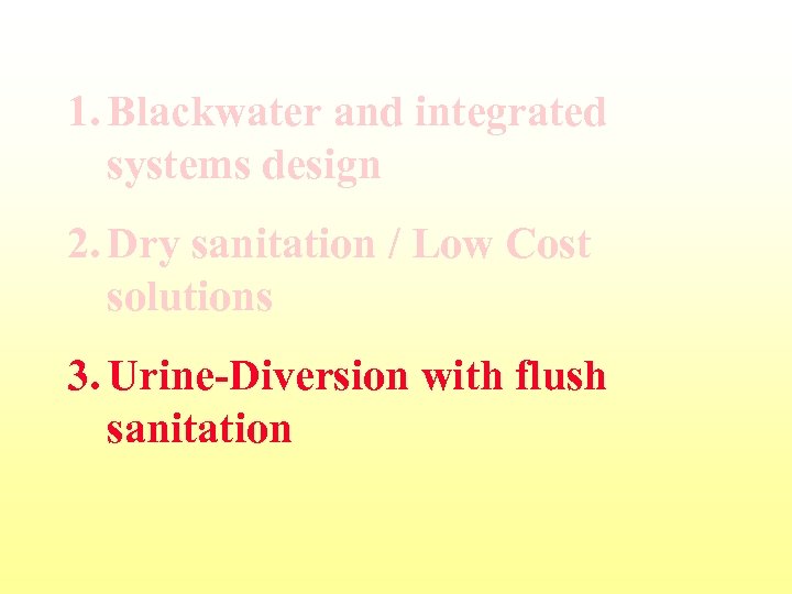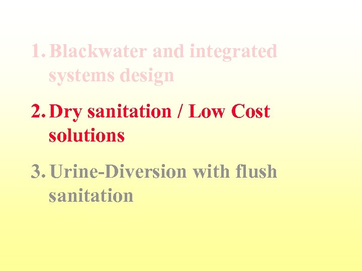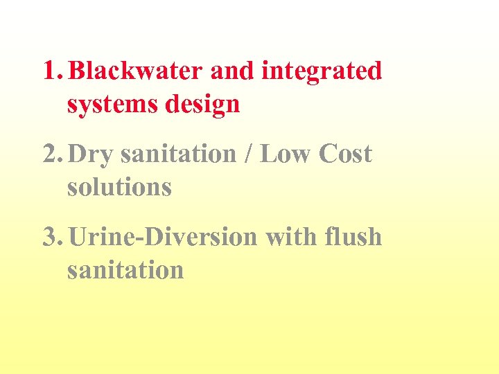 1. Blackwater and integrated systems design 2. Dry sanitation / Low Cost solutions 3. Urine-Diversion with flush sanitation