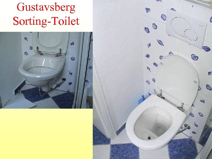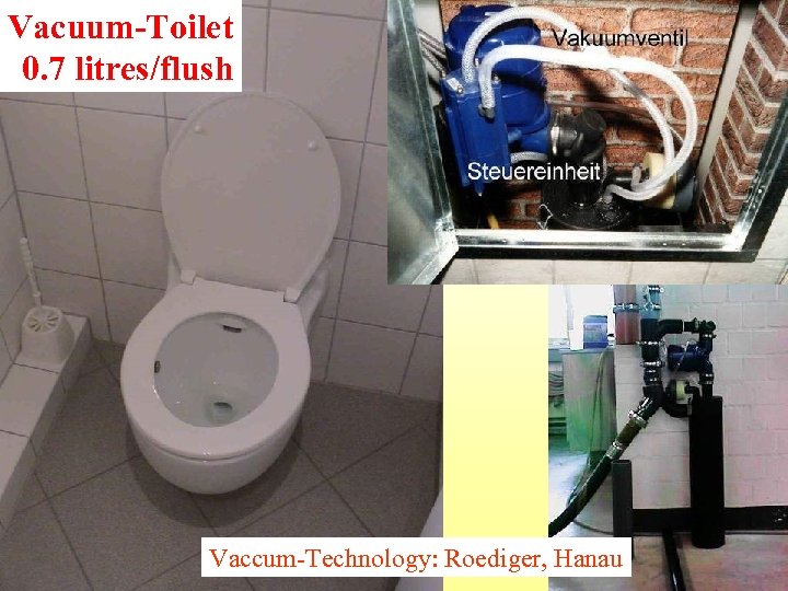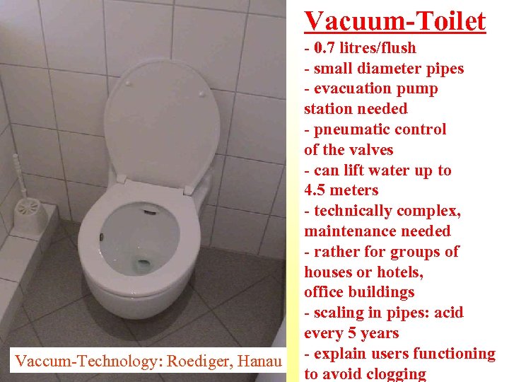 Vacuum-Toilet Vaccum-Technology: Roediger, Hanau - 0. 7 litres/flush - small diameter pipes - evacuation pump station needed - pneumatic control of the valves - can lift water up to 4. 5 meters - technically complex, maintenance needed - rather for groups of houses or hotels, office buildings - scaling in pipes: acid every 5 years - explain users functioning to avoid clogging