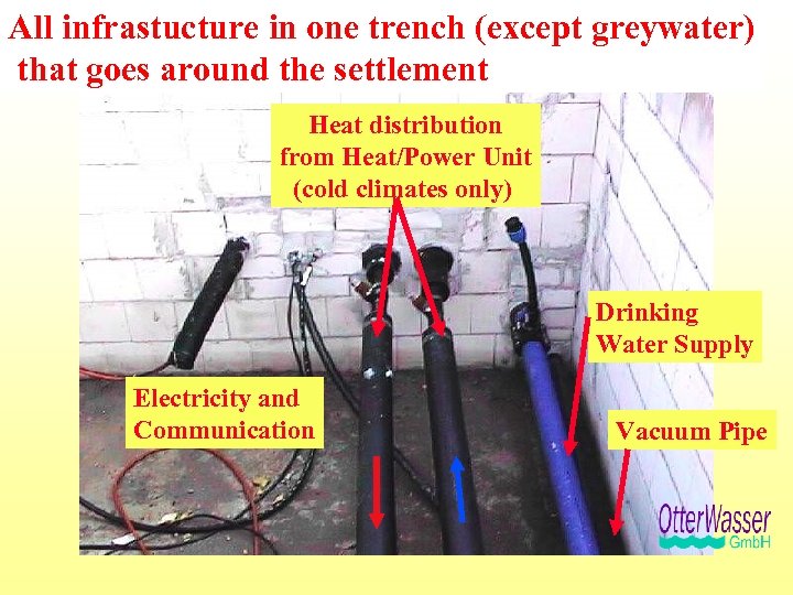 All infrastucture in one trench (except greywater) that goes around the settlement Lübeck-Flintenbreite Heat distribution from Heat/Power Unit (cold climates only) Drinking Water Supply Electricity and Communication Vacuum Pipe