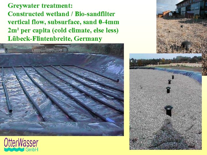 Greywater treatment: Constructed wetland / Bio-sandfilter vertical flow, subsurface, sand 0 -4 mm 2 m² per capita (cold climate, else less) Lübeck-Flintenbreite, Germany
