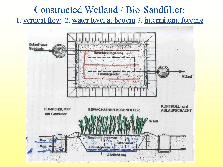 Constructed Wetland / Bio-Sandfilter: 1. vertical flow 2. water level at bottom 3. intermittant feeding