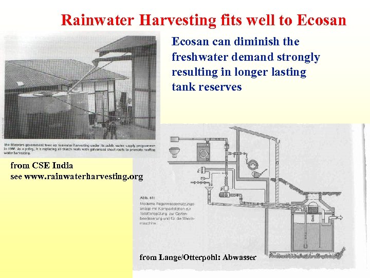 Rainwater Harvesting fits well to Ecosan can diminish the freshwater demand strongly resulting in longer lasting tank reserves from CSE India see www. rainwaterharvesting. org from Lange/Otterpohl: Abwasser