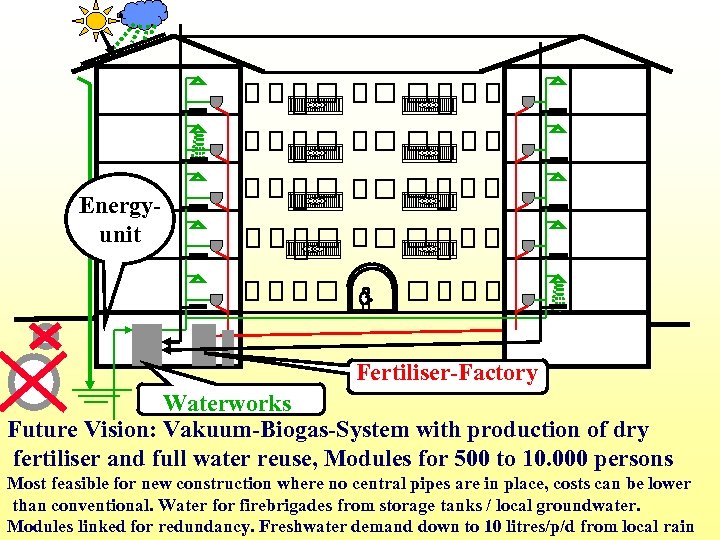 Energyunit Fertiliser-Factory Waterworks Future Vision: Vakuum-Biogas-System with production of dry fertiliser and full water reuse, Modules for 500 to 10. 000 persons Most feasible for new construction where no central pipes are in place, costs can be lower than conventional. Water for firebrigades from storage tanks / local groundwater. Modules linked for redundancy. Freshwater demand down to 10 litres/p/d from local rain