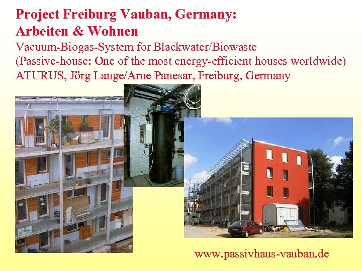 Project Freiburg Vauban, Germany: Arbeiten & Wohnen Vacuum-Biogas-System for Blackwater/Biowaste (Passive-house: One of the most energy-efficient houses worldwide) ATURUS, Jörg Lange/Arne Panesar, Freiburg, Germany www. passivhaus-vauban. de