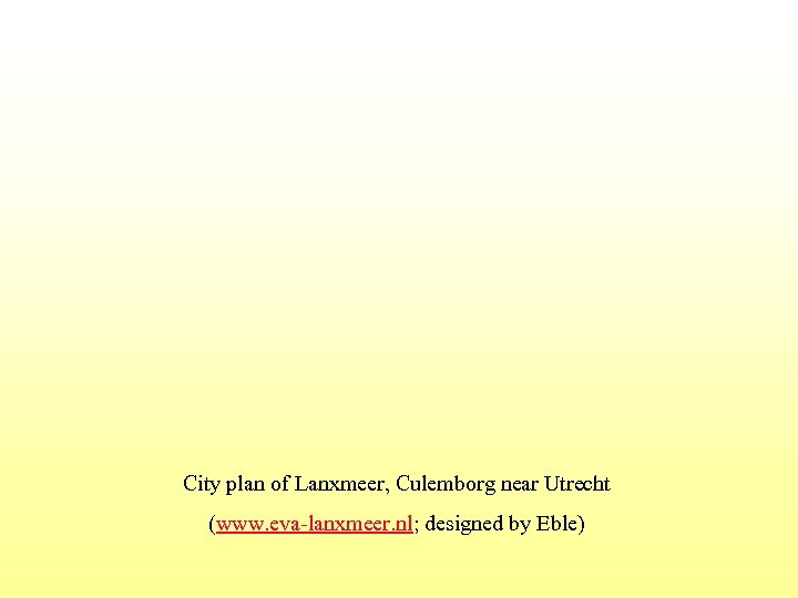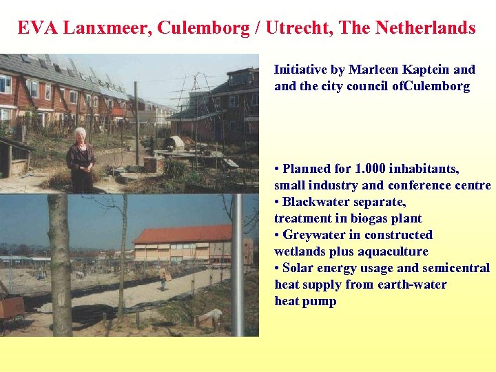 EVA Lanxmeer, Culemborg / Utrecht, The Netherlands Initiative by Marleen Kaptein and the city council of. Culemborg • Planned for 1. 000 inhabitants, small industry and conference centre • Blackwater separate, treatment in biogas plant • Greywater in constructed wetlands plus aquaculture • Solar energy usage and semicentral heat supply from earth-water heat pump