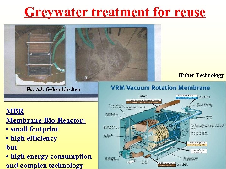 Greywater treatment for reuse Huber Technology Fa. A 3, Gelsenkirchen MBR Membrane-Bio-Reactor: • small footprint • high efficiency but • high energy consumption and complex technology