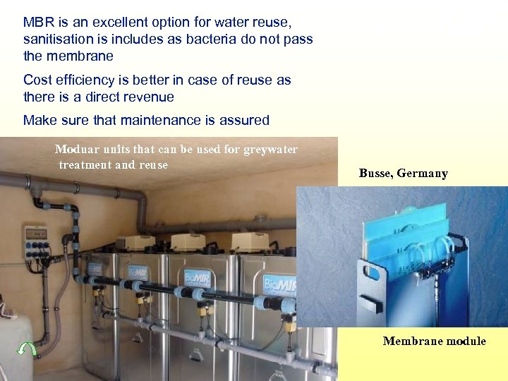 MBR is an excellent option for water reuse, sanitisation is includes as bacteria do not pass the membrane Cost efficiency is better in case of reuse as there is a direct revenue Make sure that maintenance is assured Moduar units that can be used for greywater treatment and reuse Busse, Germany Membrane module