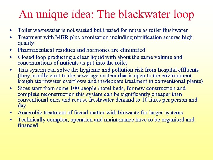 An unique idea: The blackwater loop • Toilet wastewater is not wasted but treated for reuse as toilet flushwater • Treatment with MBR plus ozonisation including nitrification assures high quality • Pharmaceutical residues and hormones are eliminated • Closed loop producing a clear liquid with about the same volume and concentrations of nutients as put into the toilet • This system can solve the hygienic and pollution risk from hospital effluents (they usually emit to the sewerage system that is open to the environment trough stormwater overflows and inadequate treatment in conventional plants) • Sizes start from some 100 people /hotel beds, for new construction and complete reconstruction this system can be significantly cheaper than conventional ones and reduse freshwater demand to 10 litres person and day • Anaerobic treatment of faecal matter with biowaste for larger systems • Technically complex, operation and maintenance have to be organised and financed