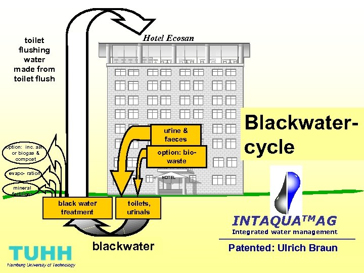 Hotel Ecosan toilet flushing water made from toilet flush urine & faeces option: inc. ash, or biogas & compost option: biowaste evapo- ration Blackwatercycle HOTEL mineral fertiliser black water treatment toilets, urinals INTAQUATMAG Integrated water management blackwater Patented: Ulrich Braun