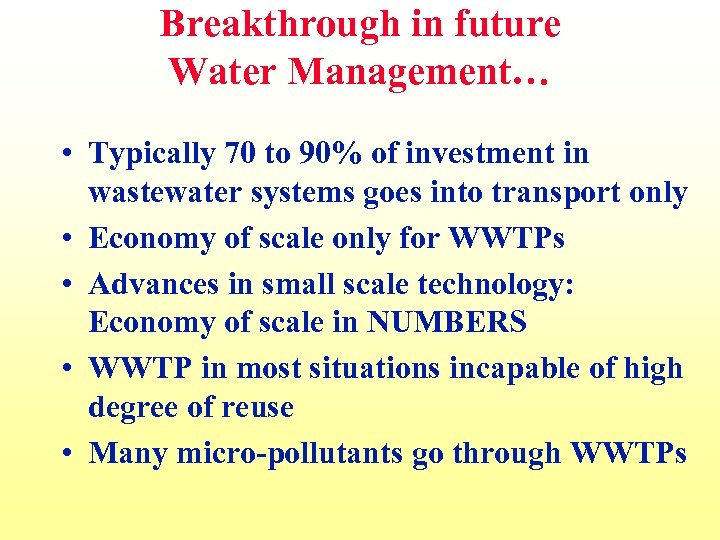 Breakthrough in future Water Management… • Typically 70 to 90% of investment in wastewater systems goes into transport only • Economy of scale only for WWTPs • Advances in small scale technology: Economy of scale in NUMBERS • WWTP in most situations incapable of high degree of reuse • Many micro-pollutants go through WWTPs