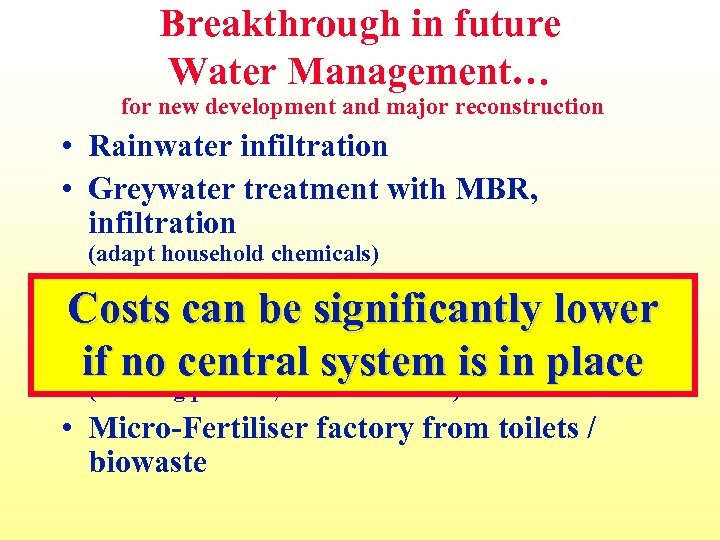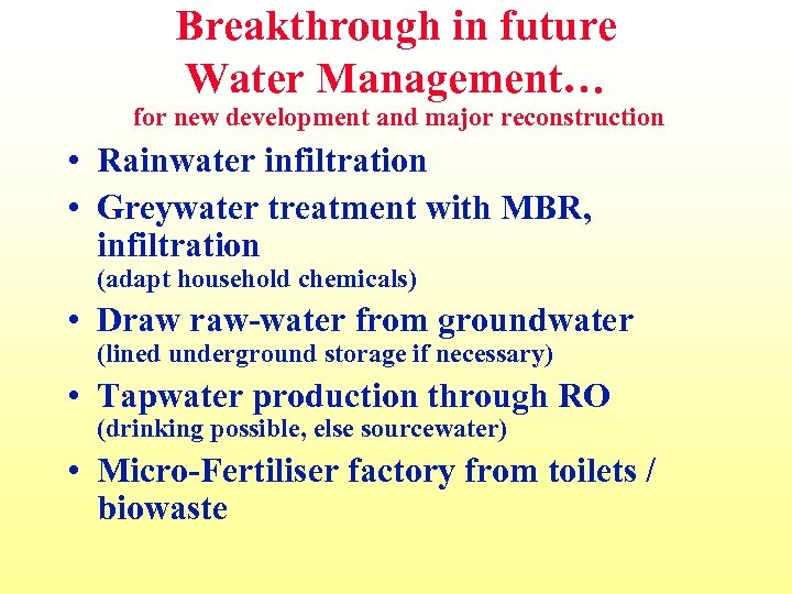 Breakthrough in future Water Management… for new development and major reconstruction • Rainwater infiltration • Greywater treatment with MBR, infiltration (adapt household chemicals) • Draw raw-water from groundwater (lined underground storage if necessary) • Tapwater production through RO (drinking possible, else sourcewater) • Micro-Fertiliser factory from toilets / biowaste