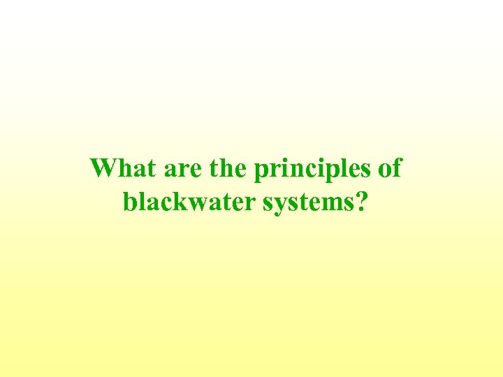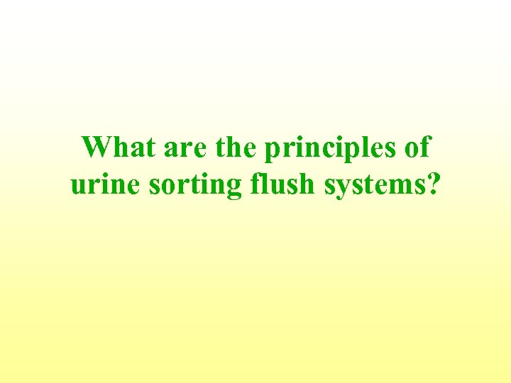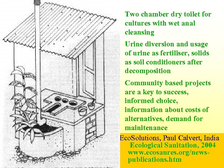 Two chamber dry toilet for cultures with wet anal cleansing Urine diversion and usage of urine as fertiliser, solids as soil conditioners after decomposition Community based projects are a key to success, informed choice, information about costs of alternatives, demand for mainitenance Eco. Solutions, Paul Calvert, India Ecological Sanitation, 2004 www. ecosanres. org/newspublications. htm