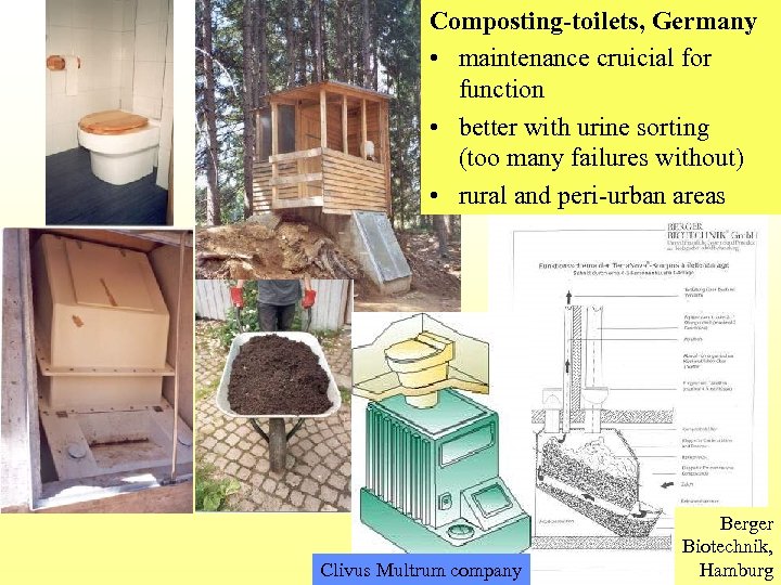 Composting-toilets, Germany • maintenance cruicial for function • better with urine sorting (too many failures without) • rural and peri-urban areas Clivus Multrum company Berger Biotechnik, Hamburg