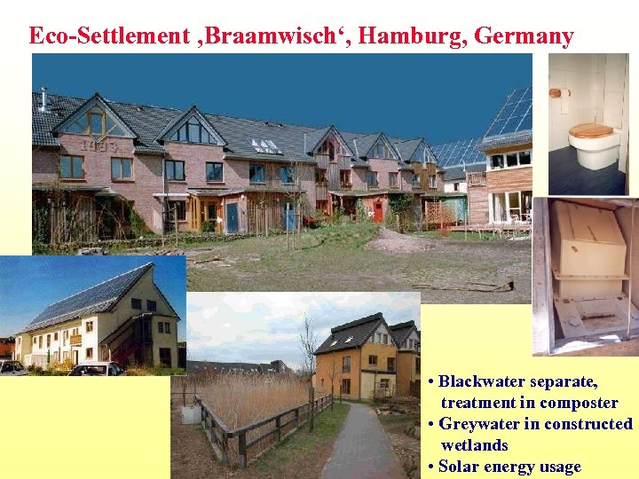 Eco-Settlement ‚Braamwisch‘, Hamburg, Germany • Blackwater separate, treatment in composter • Greywater in constructed wetlands • Solar energy usage