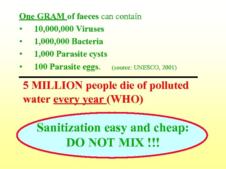 One GRAM of faeces can contain • 10, 000 Viruses • 1, 000 Bacteria • 1, 000 Parasite cysts • 100 Parasite eggs. (source: UNESCO, 2001) 5 MILLION people die of polluted water every year (WHO) Sanitization easy and cheap: DO NOT MIX !!!