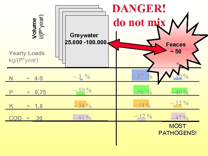 Volume l/(P*year) DANGER! do not mix Greywater 25. 000 -100. 000 Feaces ~ 50 Yearly Loads kg/(P*year) N ~ 4 -5 ~3 % ~ 87 % ~ 10 % P ~ 0, 75 ~ 10 % ~50 % ~ 40 % K ~ 1, 8 ~ 34 % ~ 54 % ~ 12 % ~ 41 % ~ 12 % ~ 47 % COD ~ 30 MOST PATHOGENS!