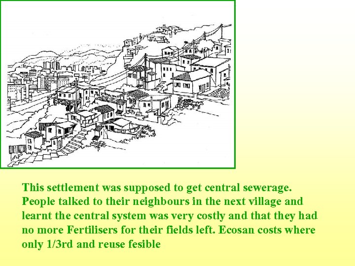 This settlement was supposed to get central sewerage. People talked to their neighbours in the next village and learnt the central system was very costly and that they had no more Fertilisers for their fields left. Ecosan costs where only 1/3 rd and reuse fesible