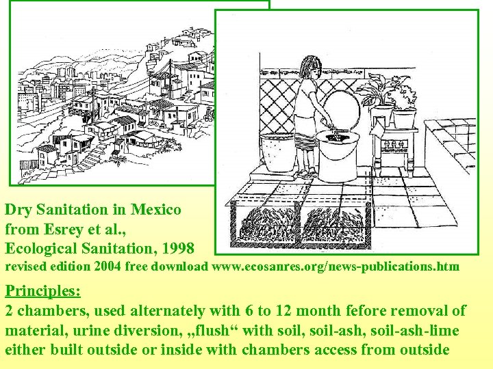 Dry Sanitation in Mexico from Esrey et al. , Ecological Sanitation, 1998 revised edition 2004 free download www. ecosanres. org/news-publications. htm Principles: 2 chambers, used alternately with 6 to 12 month fefore removal of material, urine diversion, „flush“ with soil, soil-ash-lime either built outside or inside with chambers access from outside