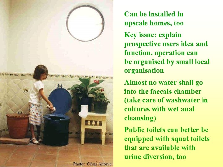 Can be installed in upscale homes, too Key issue: explain prospective users idea and function, operation can be organised by small local organisation Almost no water shall go into the faecals chamber (take care of washwater in cultures with wet anal cleansing) Public toilets can better be equipped with squat toilets that are available with urine diversion, too