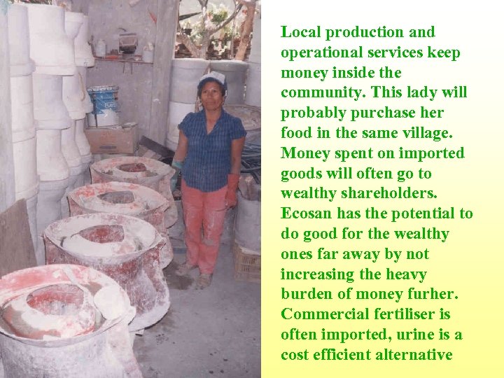 Local production and operational services keep money inside the community. This lady will probably purchase her food in the same village. Money spent on imported goods will often go to wealthy shareholders. Ecosan has the potential to do good for the wealthy ones far away by not increasing the heavy burden of money furher. Commercial fertiliser is often imported, urine is a cost efficient alternative