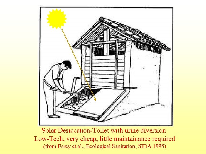 Solar Desiccation-Toilet with urine diversion Low-Tech, very cheap, little maintainance required (from Esrey et al. , Ecological Sanitation, SIDA 1998)