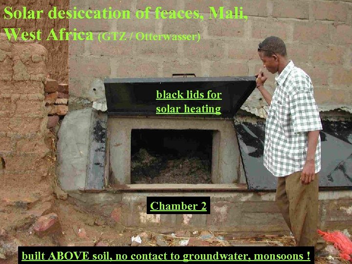 Solar desiccation of feaces, Mali, West Africa (GTZ / Otterwasser) black lids for solar heating Chamber 2 built ABOVE soil, no contact to groundwater, monsoons !