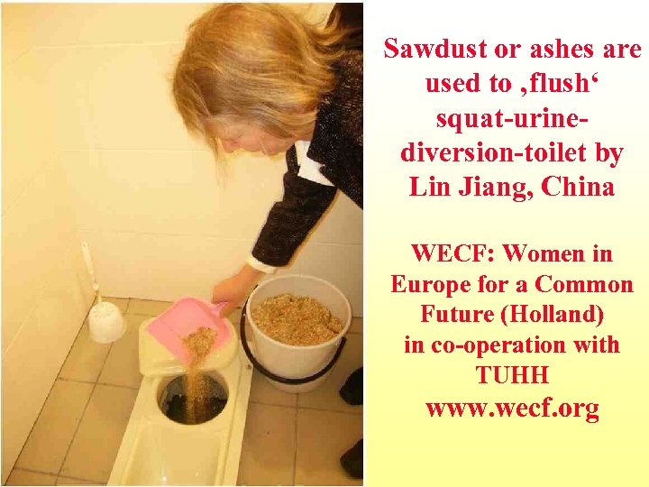 Sawdust or ashes are used to ‚flush‘ squat-urinediversion-toilet by Lin Jiang, China WECF: Women in Europe for a Common Future (Holland) in co-operation with TUHH www. wecf. org
