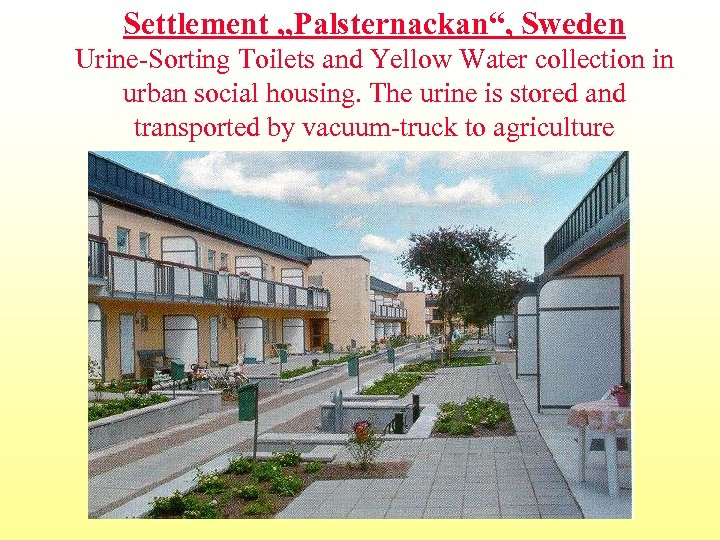 Settlement „Palsternackan“, Sweden Urine-Sorting Toilets and Yellow Water collection in urban social housing. The urine is stored and transported by vacuum-truck to agriculture