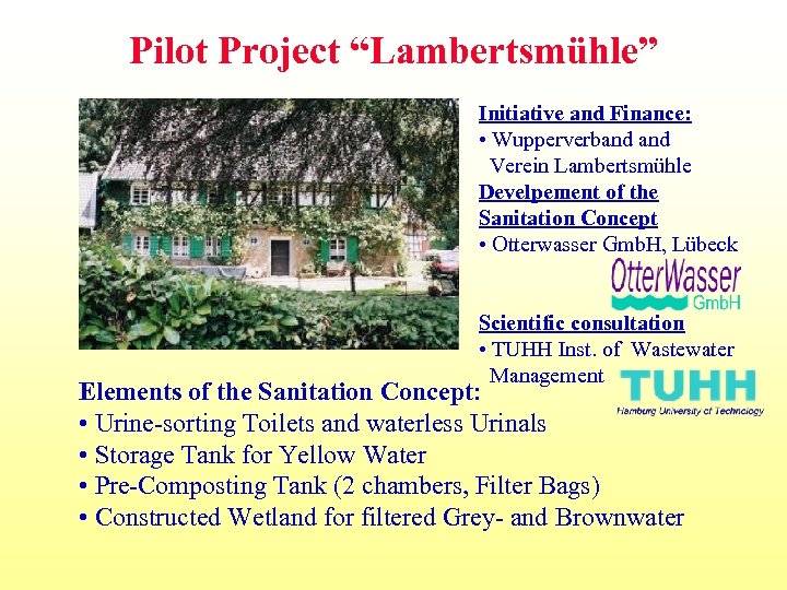 Pilot Project “Lambertsmühle” Initiative and Finance: • Wupperverband Verein Lambertsmühle Develpement of the Sanitation Concept • Otterwasser Gmb. H, Lübeck Scientific consultation • TUHH Inst. of Wastewater Management Elements of the Sanitation Concept: • Urine-sorting Toilets and waterless Urinals • Storage Tank for Yellow Water • Pre-Composting Tank (2 chambers, Filter Bags) • Constructed Wetland for filtered Grey- and Brownwater