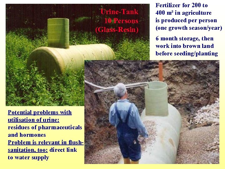 Urine-Tank 10 Persons (Glass-Resin) Fertilizer for 200 to 400 m² in agriculture is produced person (one growth season/year) 6 month storage, then work into brown land before seeding/planting Potential problems with utilisation of urine: residues of pharmaceuticals and hormones Problem is relevant in flushsanitation, too: direct link to water supply